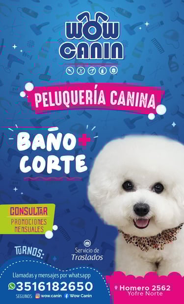 En WOW CANIN cuidamos a tu mascota como en casa: peluquería, traslados y productos para mimarla todos los días. Atención personalizada y de confianza en nuestras dos sucursales, barrio Yofre y Centro.